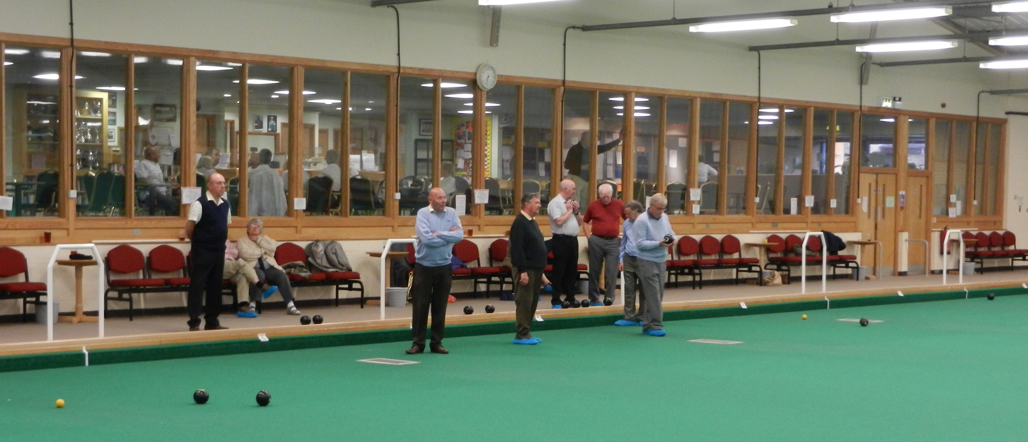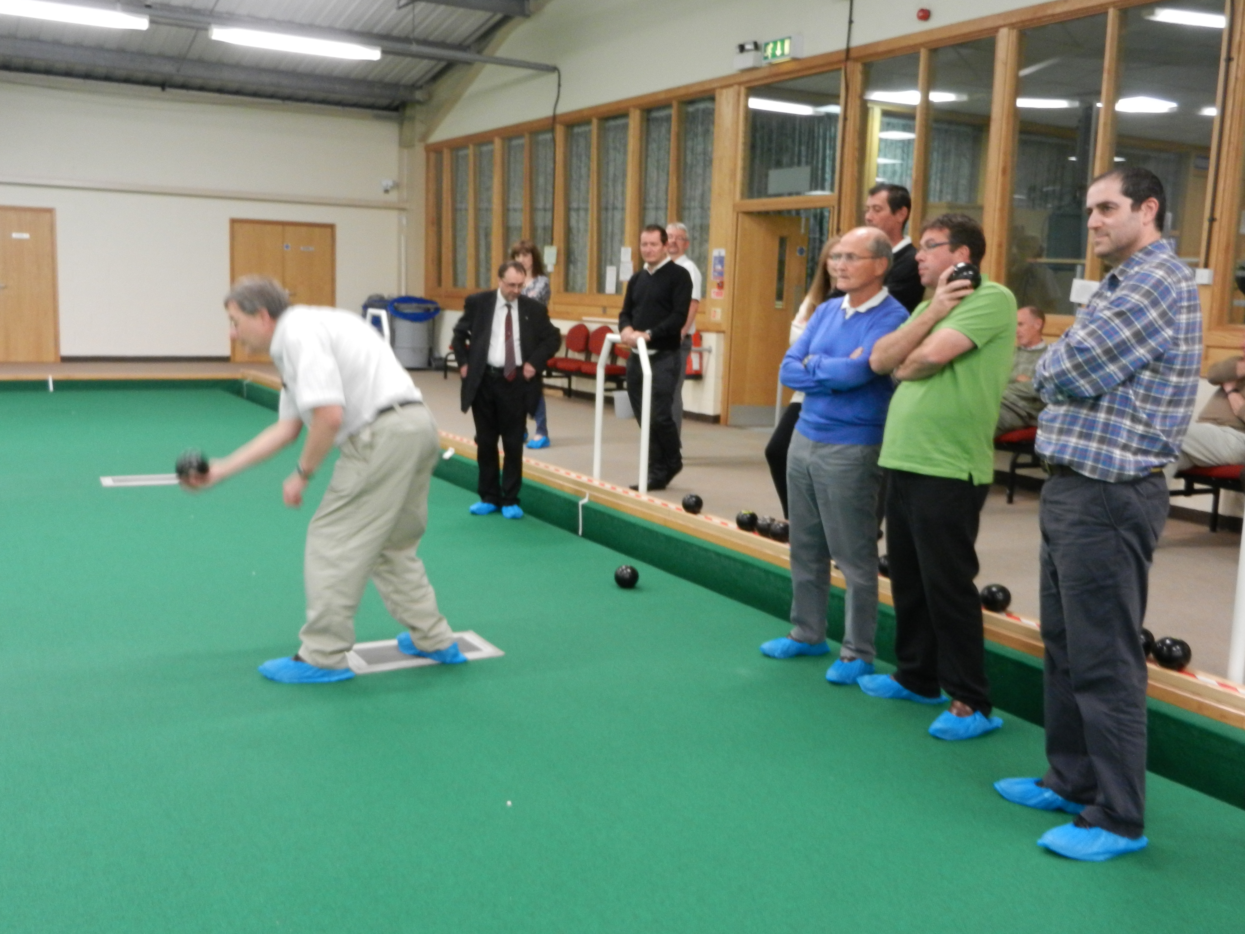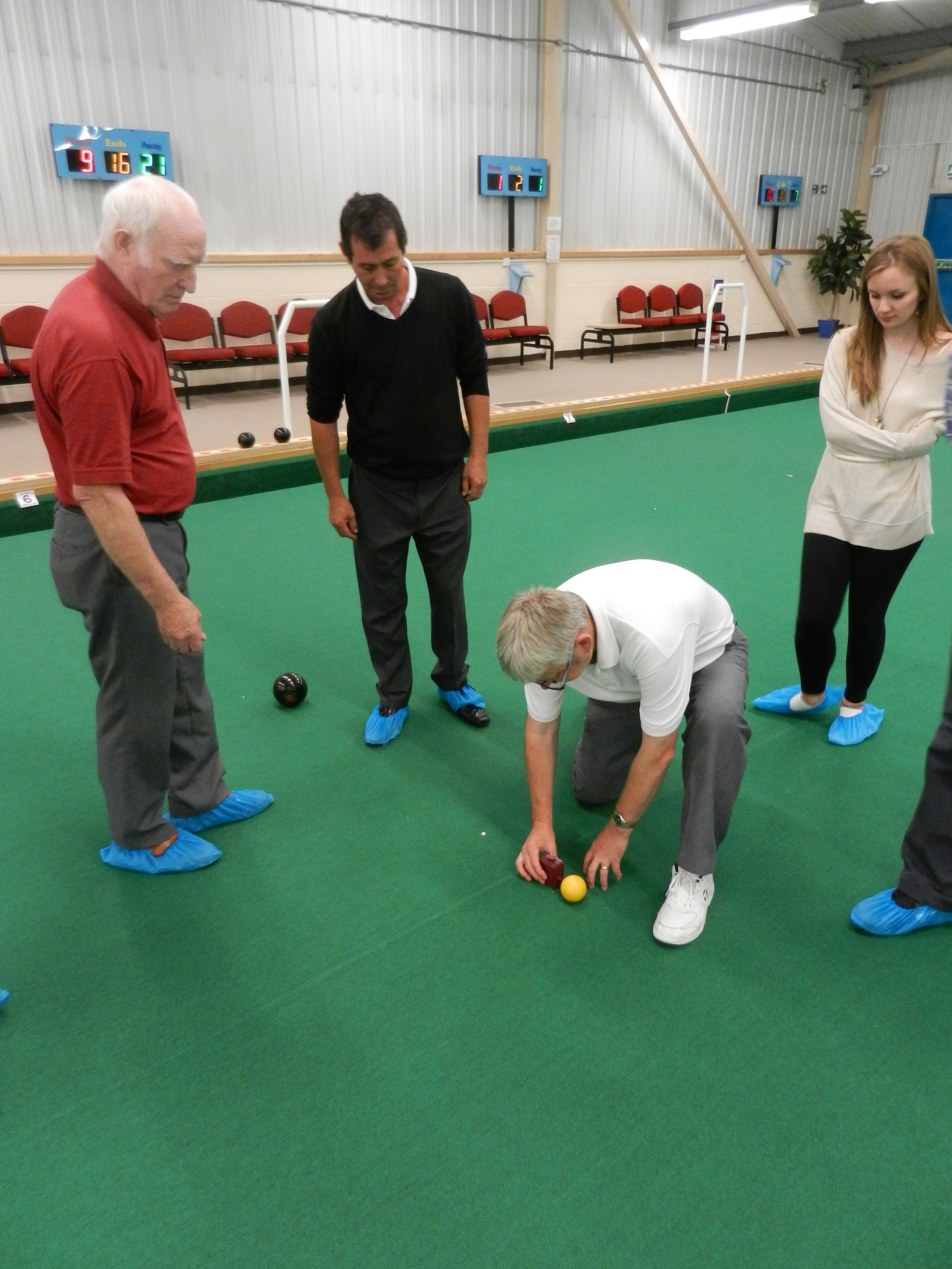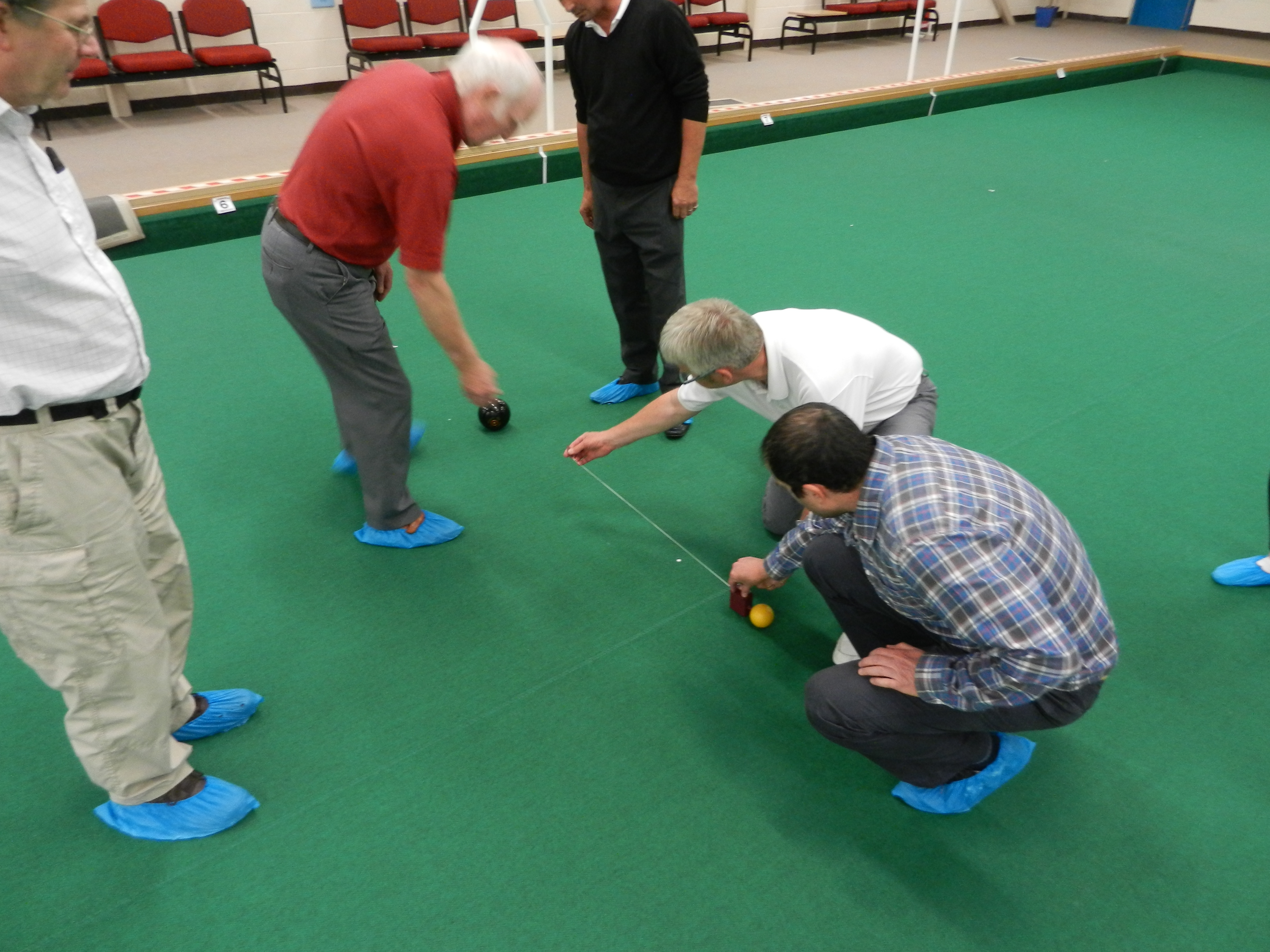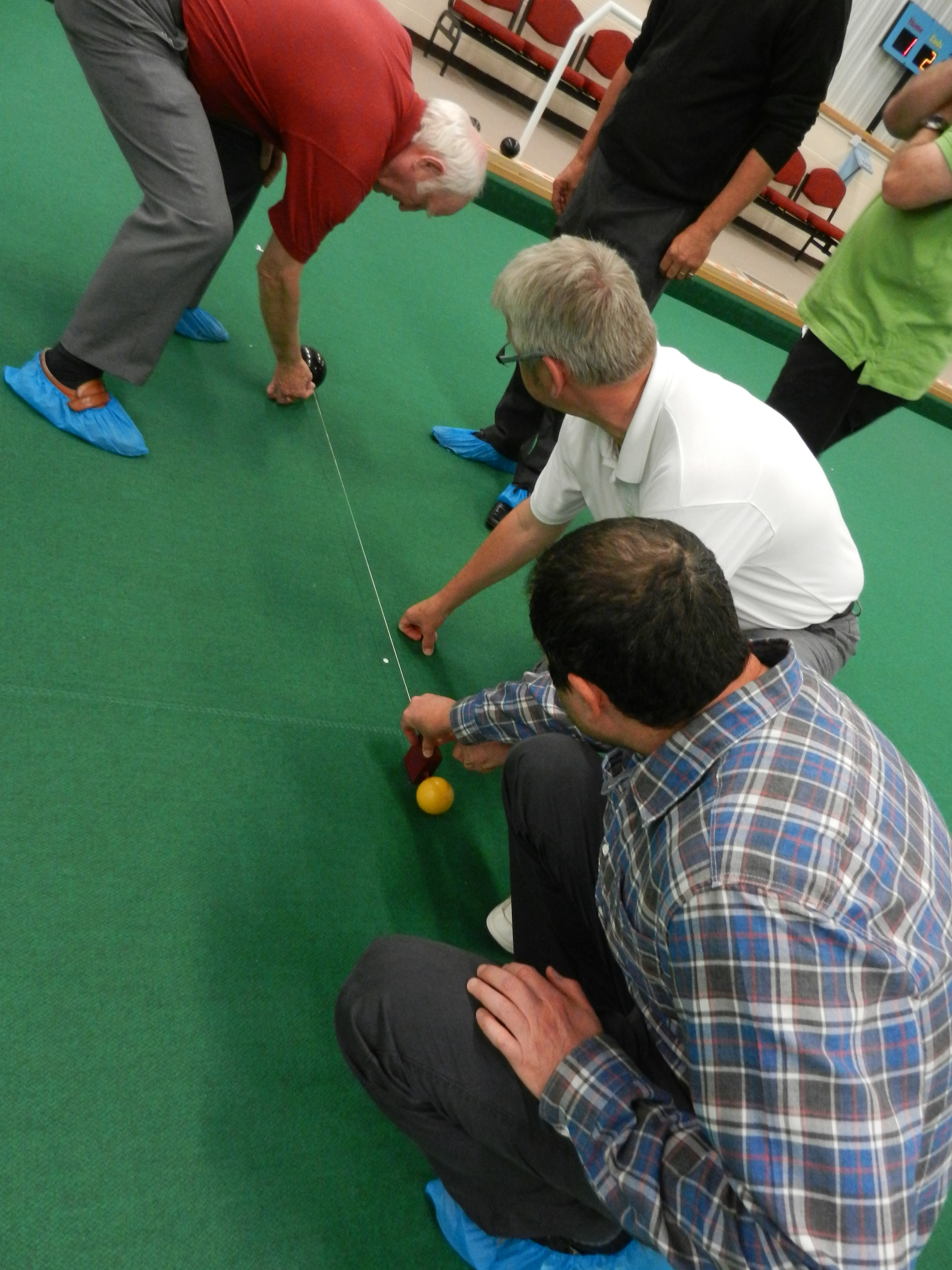 in a good, and possibly 'winning' position. Meopham bowled and knocked a Swanley bowl away leaving the outer bowls in play. A tape measure and deep scrutiny revealed Meopham scored two - with just an INCH in the difference between a bowl from each team, deciding the winner of that 'end', 2 points to Meopham!